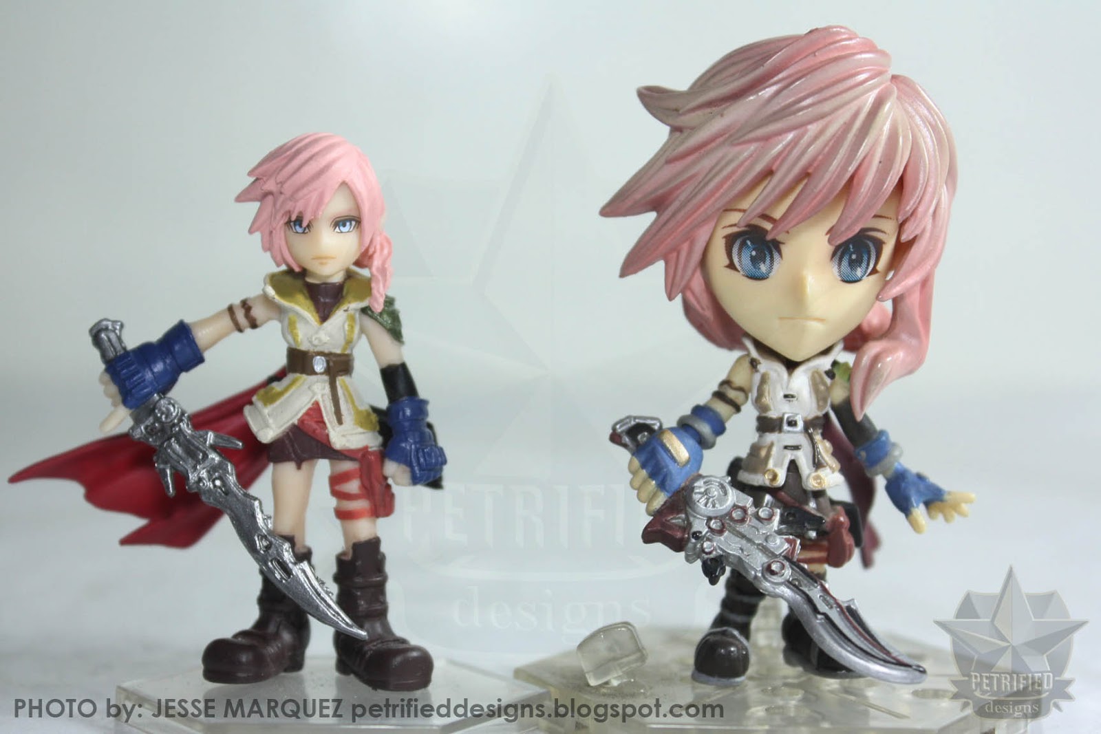 Here's the Trading Arts Lightning compared with her Play Arts Kai action figure versions The left is the Lightning Returns: FFXIII version and the right is the Dissidia Arcade/NT version.