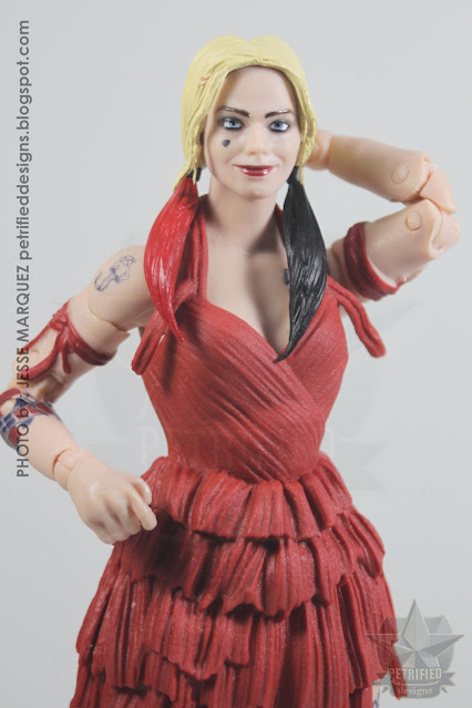 This version of Harley is wearing a nice, but tattered red dress. They chose this look for the action figure and not Harley's normal look seen in the movie's intro. This is what she's wearing for the most part of the movie. This is her look in the conflict and climax part of the movie. The dress is really detailed but it lack some shadings to make those details more visible.